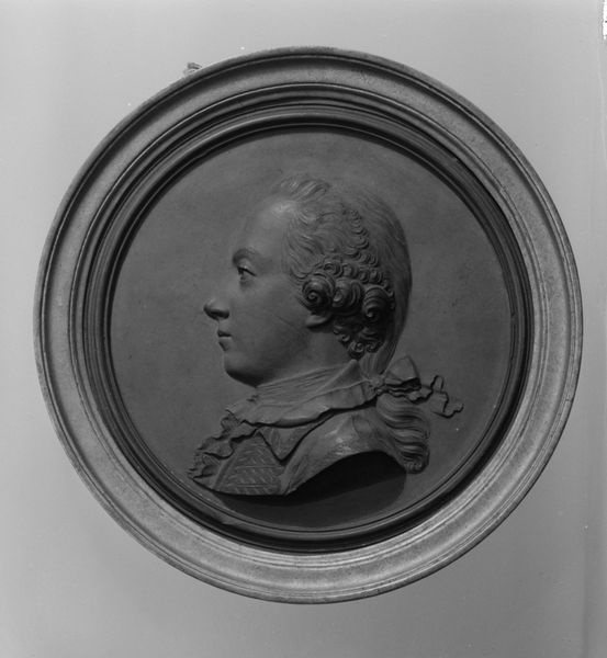 Curator: At the Metropolitan Museum of Art we have a striking sculptural profile, crafted sometime between 1800 and 1850. Editor: It’s quite austere, isn't it? The severe profile against that stark black background... a kind of classical formality in miniature. Curator: Precisely. The piece reflects Neoclassical sensibilities with its clean lines and focus on the portrait, an approach favored by Marie Honoré Renaud, the artist. Its composition offers a portrait meant to last through centuries, as they often did, worn on pendants or brooches. Editor: And that profile… such deliberate reduction. The stark white form set against black allows one to focus on shape. The line of the nose, the curl of the wig, are clearly defined. How do you think its intended audience might have perceived that economy of detail? Curator: I think that simplification communicated virtue and intellect, aligning with Enlightenment ideals. The sharp silhouette recalls classical cameos—an echo of republican Rome intended to evoke notions of high morals. These symbolic connotations added prestige to the portrait's sitter, but also underscored the values they would have hoped to be remembered for. Editor: Interesting. The cold precision almost negates emotional accessibility for modern viewers. It becomes an abstract symbol *of* power, perhaps, rather than simply representing the man himself. And, being worn on the body as decoration, would that make the wearer someone of political persuasion, or a status symbol, perhaps? Curator: Quite possibly both! By having his likeness made and displayed, the wearer participates in its visual vocabulary, whether intentionally or not. A fascinating dialogue between visibility, meaning, and power, don't you think? Editor: Indeed. Looking again, that formal precision almost becomes... expressive, in its own way. Almost hinting at an identity that defies its own time. Curator: Absolutely, each element opens further windows for analysis. Thank you.