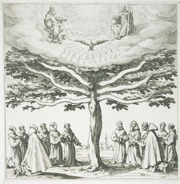 Curator: What an elegant composition! This is Jacques Callot's "The Tree of Saint Francis," a detailed print currently residing at the Harvard Art Museums. Editor: There's a dreamlike quality to the scene. The figures under the tree are so grounded while above them, the Holy figures float in the heavens. Curator: Note the strong verticality established by the central tree, a powerful structural element. The etching technique allows for incredibly fine lines, defining textures and forms with remarkable precision. Editor: Absolutely. The arrangement seems deliberate, almost staged. Callot captures a moment of reflection within a specific religious and social context. The Franciscans embody ideals of poverty and humility. Curator: Precisely. The ethereal light emanating from above illuminates the scene, creating a visual hierarchy that emphasizes divine presence. The graphic language constructs a very persuasive argument. Editor: The context here is very important. It would have been made during the Reformation to portray Catholic figures in a positive light. Considering the historical backdrop enhances its value. Curator: Indeed. Callot's mastery of line and form elevates a religious subject into a masterclass of printmaking. Editor: A fascinating glimpse into faith, artistry, and the cultural climate of its time.