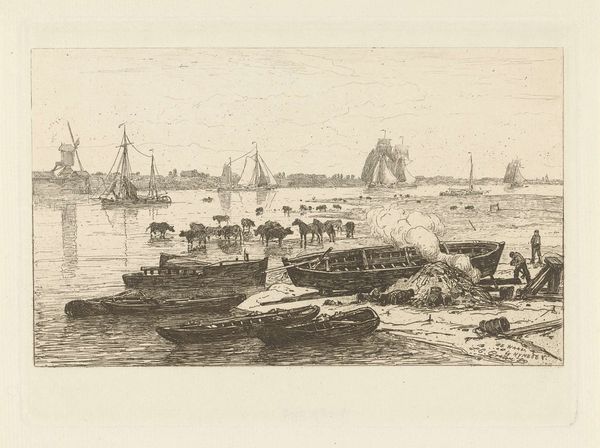 Elias Stark made this river landscape with village and sawmill. The image’s fine lines were achieved using etching, a printmaking process requiring a metal plate, usually copper or zinc. First, the plate is coated with a waxy, acid-resistant substance called a ground. Then the artist scratches the design into the ground, exposing the metal. When the plate is dipped in acid, the exposed lines are eaten away, creating grooves. The deeper the lines, the more ink they hold. Here, Stark's skillful etching captures the textures of the water, buildings, and foliage with remarkable detail. The subtle variations in line weight and density create a sense of depth and atmosphere. The windmills remind us of the Dutch landscape and a very particular energy source, one that powered the sawing of timber. The artist drew them with precision, highlighting their importance to the local economy and their integration into the natural environment. Looking at the final print, we should appreciate the labor involved in the entire process, from the preparation of the plate to the final impression. Considering the amount of work involved, we can begin to see how traditional distinctions between fine art and craft become blurred.