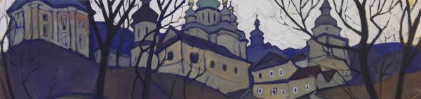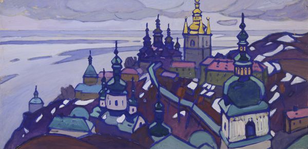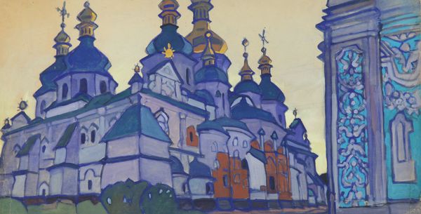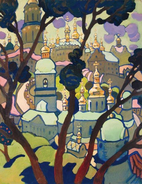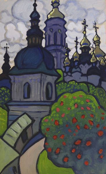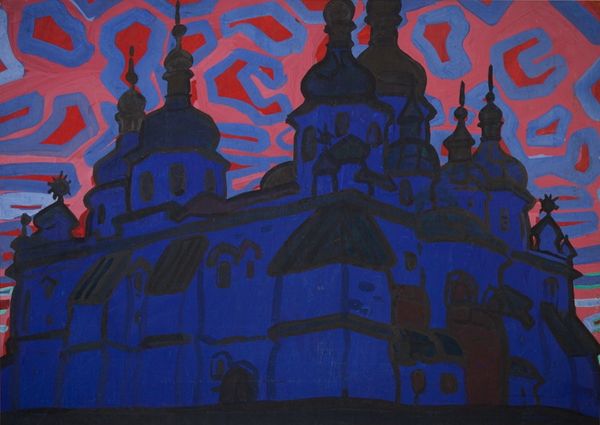 Editor: This painting, "The bell tower of the Near and Far Caves (Kyiv Lavra)", was completed in 1993 by Yuriy Khymych, using acrylic paint. The striking angularity gives it such a strong presence. What are your first impressions? Curator: Notice how Khymych focuses on the materiality of the built environment itself. Look at the pigments! They are not blended to mimic reality, but applied rawly, highlighting the constructed nature of both the towers and the painting itself. We see the labor involved in producing these monuments and in producing this artwork. How do you see this relates to the time when the artwork was made, 1993? Editor: Well, Ukraine had just declared independence in 1991, so perhaps this bold, unblended style reflects a breaking away from tradition. Almost like declaring artistic independence too! Curator: Exactly! And consider the social context: Acrylic paint, while commercially available, became a symbol of artistic freedom and democratisation. It presented an alternative to traditional techniques, available to a wider range of artists. Also, how do you see that his composition of the religious structures interacts with those concepts of industrial production? Editor: I suppose there’s a contrast. We have the bell towers, representing history, faith and the weight of tradition… but painted with modern, almost mass-produced materials. It kind of levels the playing field between the old world and the new. Curator: Precisely. This artwork prompts us to think critically about the materials themselves. We consider not just their aesthetic qualities, but also the societal shifts and the changing dynamics of artistic production they embody. What is one thing that strikes you? Editor: Thinking about the materials and their context really brings out a new layer of meaning that I hadn't considered. It is interesting to see tradition painted with modern resources!