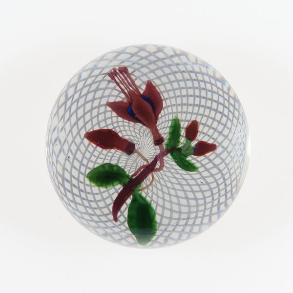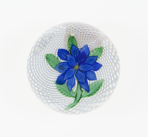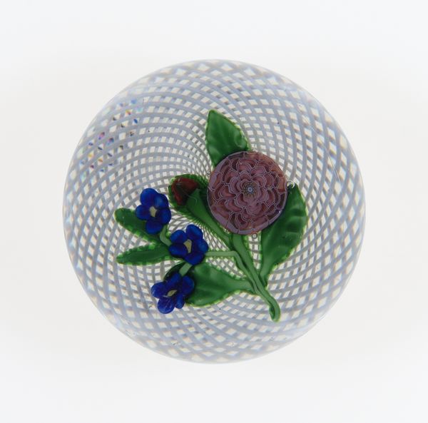 This glass paperweight was produced by the Boston and Sandwich Glass Company sometime between 1825 and 1888. Encased within clear glass is a complex arrangement of millefiori and lampwork. The eye is immediately drawn to the central floral motif, a vibrant cluster of petals in shades of red, blue, and yellow. It is carefully placed within a swirling latticino pattern. This design creates a dynamic contrast between the static floral element and the fluid, almost hypnotic, background. Consider the delicate balance achieved through the contrast of textures: the smooth, reflective surface of the glass against the intricate details of the floral arrangement and the latticework. The internal structure of the paperweight invites a visual experience which destabilizes our expectations of depth and perspective. The work challenges our sense of fixed meaning, inviting endless interpretations and perceptions.