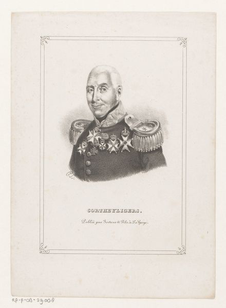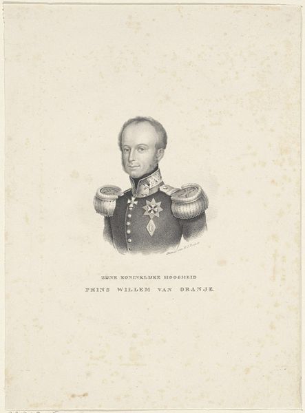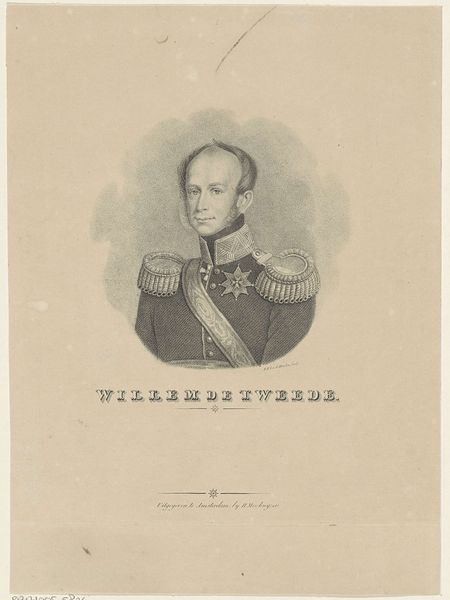 Editor: This is a portrait of Willem II, King of the Netherlands, made around 1830-1845. I see that it's located at the Rijksmuseum. The style reminds me of old engravings, creating a really classic, stately mood. What jumps out at you? Curator: Beyond the King's regal attire, consider the deliberate arrangement of symbols on his uniform. Each medal, each epaulette, acts as a potent visual marker, reinforcing his authority. It's not merely a portrait, but a careful construction of power through iconography. Editor: So the symbols become almost like a language? How much would the average person at the time have understood this "language?" Curator: Precisely! Think of it as a visual shorthand. The arrangement and selection of symbols are carefully considered. They signal not just rank, but also affiliations, achievements, and allegiance to particular values or institutions. Understanding that semiotic weight would've been quite common for a large part of the population. Editor: It’s almost like today's brands and logos; instant recognition! Curator: An insightful comparison. Indeed, these symbols tap into deep cultural memories. For the ruling classes, continuity and historical legitimacy are of utmost importance. Through imagery, they actively shape and cultivate national identity, making claims about historical importance. What else stands out for you? Editor: I think I initially just saw it as an old portrait, but realizing how the details are there to communicate specific messages adds so much depth. Thanks for helping me see it that way! Curator: My pleasure! The enduring power of visual symbols lies in their ability to resonate across time, bridging the past with the present.