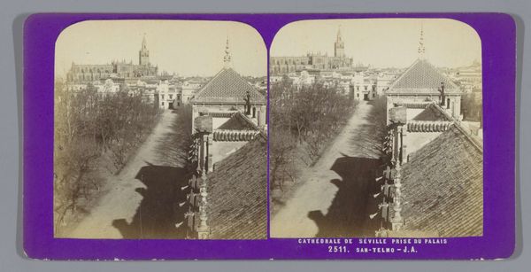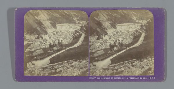 Curator: We’re looking at a striking photographic print by Jean Andrieu, titled "Gezicht op Hondarribia," placing it sometime between 1862 and 1876. Editor: Whoa, instant sepia flashback! The city perched on that little hill looks like it's levitating—some sort of ethereal cityscape caught in time. Curator: Indeed. The print adheres quite closely to principles within the realist style while exploring the conventions of landscape photography. Observe the foreground. Andrieu establishes a meticulous, spatial relationship using precise gradations. Editor: I see what you mean; he's built up these layered tiers leading up to the city. The monochrome tones are really working, and those hazy textures sort of swallow you into the view, as if it's a real-time mirage, slightly surreal, considering we know what we're seeing has probably since changed. Curator: The medium itself—photography at this stage—conveys that feeling. What may look romantic to the contemporary viewer underscores Andrieu’s use of sharp tonal contrast as part of photography's inherent documentary potential during this era. Consider the steeple reaching into the sky... it becomes a central point of reference that ties this community to some intangible presence, a higher power. Editor: Well said! You know, looking closer, it makes me think about my grandmother's old photographs; they all had this ghostly quality and captured such ordinary yet somehow poetic scenes. I'm strangely comforted, as if I were transported there. Curator: Nostalgia plays a significant role in our readings, yet that also informs a renewed sense of that community as seen by Andrieu in the original print, how this photographer attempted to offer the viewer both clarity and affect in looking at this subject. Editor: Okay, yes, the nostalgic pull is strong here, and what’s wild is, it creates its own echo long after the image was taken. That initial experience morphs and grows. Thanks for peeling the layers back on this old scene. Curator: My pleasure. The photograph reminds us that capturing space and time continues to inspire reflection across history and our contemporary present.