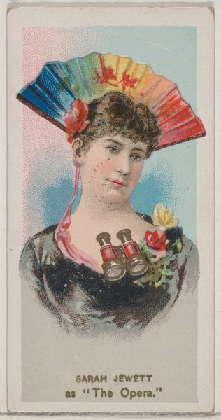Curator: Before us, we have a rather charming piece titled "Florence St. John as 'The Pansy,'" part of the series "Fancy Dress Ball Costumes" produced in 1889 for Duke brand cigarettes. Editor: Immediately, I notice the composition relies heavily on soft colors and gentle curves, creating an almost dreamlike image. The use of coloured pencil gives the piece a unique texture, too. Curator: Indeed. Tobacco cards were a popular form of advertisement. But, look closer. The choice of Florence St. John dressed as a pansy carries symbolic weight. The pansy, derived from the French word "pensée," meaning "thought," was often associated with remembrance and affection, but could also be a sly nod to more unconventional affections. Editor: That tension between the overt, floral sweetness and a possible undercurrent is interesting. Notice how the flower practically engulfs her head; it’s almost surreal, and hints at a transformation of identity. There’s a performative element in both the “fancy dress” aspect and in being consumed by the floral persona. Curator: Absolutely. The "fancy dress" element invites a discussion about societal roles. Florence is not simply wearing a costume, she's embodying an ideal, a cultivated presentation of femininity but also suggesting possibilities outside expected norms. The color choices and drawing media would reinforce those ideas. Editor: The impressionistic touches and portrait-like framing contribute to the artifice. The lack of precise details, along with her coy smile, invite a subjective, emotional response rather than a rational assessment of her likeness. She seems deliberately constructed for our gaze. Curator: Right, it's as if we're peering into a curated fantasy, and the mass-produced format brings that fantasy to the masses, a dream peddled alongside a very earthly product. It speaks to the democratization of beauty ideals in that era. Editor: Reflecting on the design, the soft execution is wonderfully matched to its purpose as advertisement. But that does also raise questions of agency within portraiture; the artist and patron were more responsible for the subject’s visual meaning and narrative than Florence herself. Curator: It’s a rich layering of social cues, fashion, and symbolism packaged into a tiny, consumable format. It reflects how imagery becomes embedded with culture, prompting us to see beneath surface impressions.