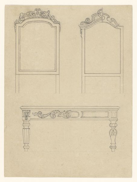 Editor: This is Frank Wenger's 1936 drawing, simply titled "Desk." It's on toned paper and looks like a design sketch. There's something both classical and very modern about it. What stands out to you in this design? Curator: The enduring power of visual symbols, wouldn’t you agree? Those faces topping the desk's legs echo caryatids, figures supporting architecture from ancient Greece. But the streamlined form suggests an almost Art Deco sensibility. It’s a fascinating juxtaposition. Editor: So it's playing with familiar architectural motifs, but with a different spin? Curator: Precisely. Ask yourself, what does it *mean* to support something? Desks, historically, have symbolized labor, knowledge, administration...What stories are those faces telling about work, about women in the workplace, if those are women depicted there? Or, conversely, are they Atlas figures weighed down by knowledge? Consider the columns as well - what message did the artist intend? Editor: That's something to think about, whether the supporting figures have a kind of gendered context. What about the use of drawing instead of a painting or a fully realized piece? Curator: This looks to be an idea-generation sketch, from a sketchbook, so, yes, this suggests an intimate glimpse into the designer’s creative process. Think about sketchbooks through the ages – private spaces where ideas germinate, free from the constraints of perfection. Editor: So, the drawing itself becomes part of the meaning. It reveals the seeds of an idea before it takes solid form. Curator: Indeed. This simple sketch encapsulates layers of cultural memory, the evolving symbolism of work, and the very human process of creation. Editor: That’s so insightful. I would have just walked by it without thinking twice. Thank you. Curator: My pleasure! Always remember: art invites us to decipher, to connect, to question, and ultimately, to see ourselves reflected in its enduring symbols.