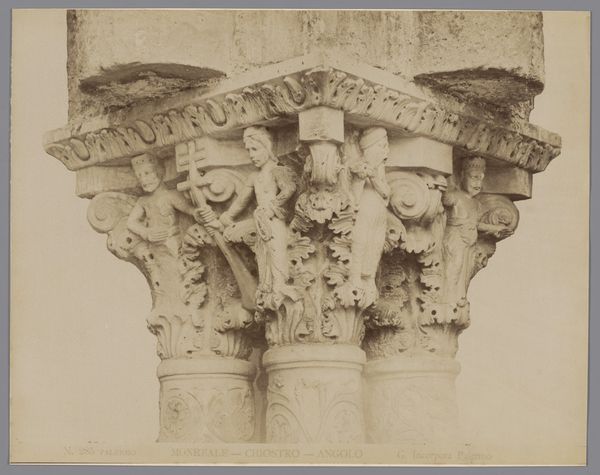 Curator: This is a photographic study, captured sometime between 1856 and 1914, of a sculpted capital. Giuseppe Incorpora is credited with this "Detailopname van een kapiteel in de kloostergang van de dom van Monreale", or a detailed shot of a capital within the cloisters of Monreale Cathedral. Editor: There's a certain serenity, isn't there? The way the light washes over the relief… it’s both imposing and delicate. The faces are remarkably expressive, even through the haze of age and the photographic process. Curator: Indeed. Monreale Cathedral, a Norman-Byzantine masterpiece in Sicily, holds tremendous socio-political weight. It represents a period of cross-cultural fertilization, where Norman rulers embraced local artistic traditions, leading to magnificent constructions meant to legitimize their power. Editor: I'm drawn to the layers of iconography, that band of figures enacting some narrative. Are these Biblical scenes, or something more secular? Their gestures are so deliberate, laden with a story begging to be deciphered. I’m curious what psychological impact these had on those who walked through these cloisters. Curator: The cloisters provided a space for contemplation. The imagery was intentionally didactic. We must remember the public role that these spaces and works served – often reinforcing not just religious beliefs but societal norms and power structures as well. It’s likely that Biblical narratives or allegorical tales intended for moral instruction would be depicted, which also served to connect those in power with a divine order. Editor: The architecture surrounding them looks like a tiny model village above each figure or groups of figures, the weight that has been depicted through this construction makes each face seem individual yet connected, like some kind of psychological tableau that stretches across centuries. It's rather fascinating to see how enduring these symbolic languages are. Curator: It reminds us of the power of art to solidify collective memory and understanding, whether intended by the Norman commissioners or not. Editor: An image that encourages contemplation on our history and legacy. Thank you.