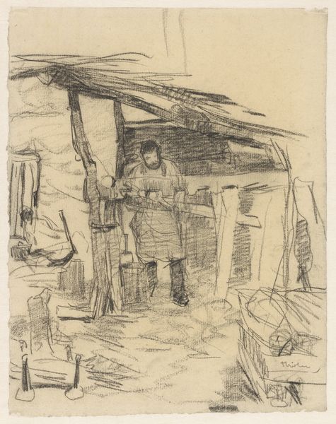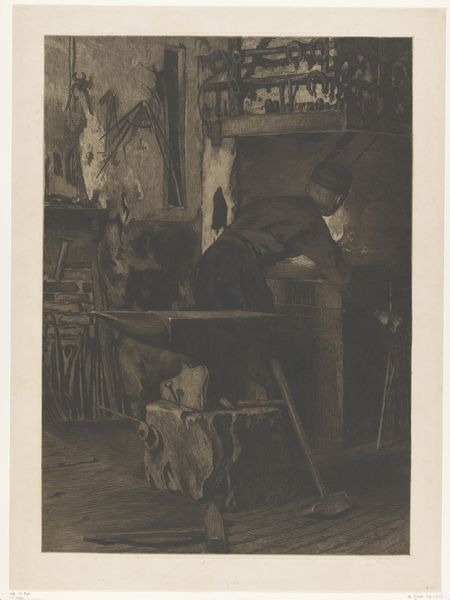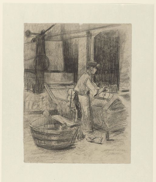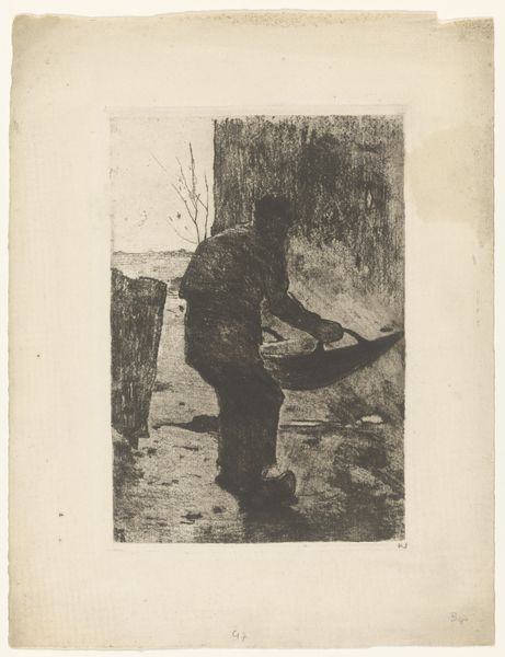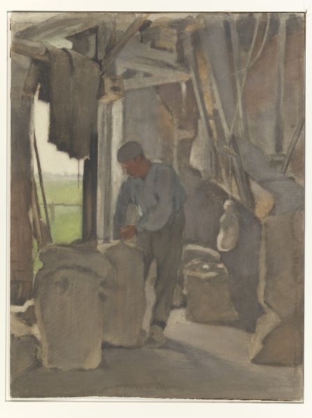 Willem Witsen made this artwork, Molenaar bij een zak meel, with etching. It's all about the mood, isn't it? A symphony of browns and grays, Witsen coaxes out the subtle drama of light in what looks like a mill interior. Look at the way the lines define the shapes – those heavy sacks of meal, the worker himself, bent over his task. There’s a rhythm in the repetition of marks, a kind of visual echo that reverberates throughout the piece. The textures he creates are so tactile; you can almost feel the rough grain of the wood, the coarse fabric of the sacks. See that spot of light catching the miller's shoulder? It’s like a tiny spotlight, drawing us to the human presence amid the machinery. This piece reminds me a little of Whistler’s nocturnes, that same interest in capturing a fleeting moment, a particular atmosphere. Like a poem, it embraces ambiguity, inviting us to linger and dream.