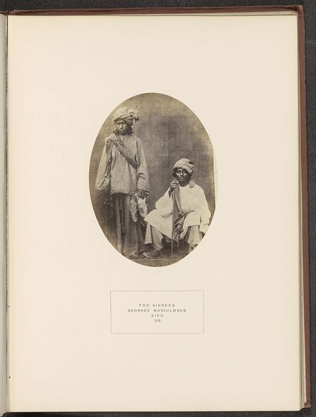 This photograph of Futtoo Khan and his brother was captured by Henry Charles Baskerville Tanner. The composition is immediately striking, enclosed within an oval frame. The tonal range, dominated by sepia, gives the scene a textured depth, emphasizing the materiality of the subjects' garments. The two figures are arranged to create a semiotic dialogue through their placement and attire. Futtoo Khan stands, adorned in elaborately embroidered robes that cascade with intricate patterns, indicative of status and artistry. His brother kneels, presenting a textile that serves as a focal point. The contrast in their positions and the textures of their clothing suggests a structured social dynamic. This photograph is more than a record; it’s a constructed image, a tableau vivant that invites us to decode the symbols of identity and profession embedded in its formal arrangement. It challenges us to consider how photography, even in its early stages, engaged with themes of representation and cultural documentation.
