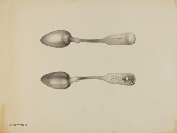 Curator: Gaze upon this simple, yet strangely captivating, drawing. Frank Nelson rendered this “Silver Teaspoon” in pencil sometime between 1935 and 1942. Editor: A spoon...drawn realistically. My first thought? A quiet sort of longing. There's something incredibly domestic and intimate about elevating such an everyday object. Like holding a forgotten memory. Curator: I find the timing fascinating, doesn’t this invoke the social context? The Great Depression was ongoing; resources were scarce. Drawing a seemingly luxurious silver spoon... was this an act of aspiration, documenting attainable wealth, or even critiquing the scarcity? Editor: Or perhaps just finding beauty in the mundane when beauty felt scarce everywhere else. Look at the light—it practically gleams. You can almost feel the coolness of the metal, or remember its gentle weight in your hand. Curator: That's precisely where the “realism” takes on importance. It almost acts as documentary realism, highlighting a certain aspiration of the interwar period. This precise realism was extremely useful during WPA era as documentation of material reality. Editor: Right, this work has me pondering... Were domestic objects viewed differently? I see beyond utility. It’s not *just* a spoon; it's about family, shared meals, maybe even small moments of elegance carved out amidst hardship. This evokes a very powerful domestic symbol for women! Curator: Yes, and that domestic symbolism also carried cultural and socio-economic weight. The possession of such a spoon might symbolize access to food or being upper class in a broader scheme. Food security. Family. These all were powerful political aspirations during the Depression Era. Editor: I think there is great profundity in capturing, on paper, one humble, overlooked teaspoon. Makes you wonder what Nelson truly hoped to convey, doesn’t it? Curator: It certainly does. Every piece invites interpretation, sometimes more than serving answers! Editor: An everyday treasure that somehow holds so much, when you sit and simply contemplate.