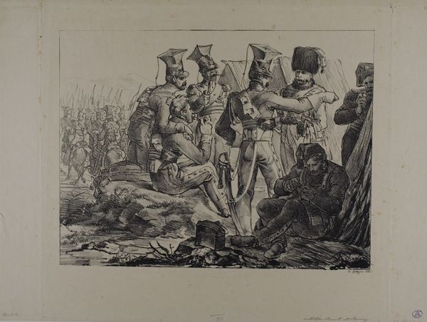 Curator: Let’s turn our attention to "Hertog Eduard van Gelre vermoord door Herman Bier, 1371," an engraving made between 1853 and 1855 by Jan van der Veen, currently held here at the Rijksmuseum. Editor: My initial impression is one of organized chaos. A collection of figures surrounding a central, vulnerable form… It all feels meticulously rendered, almost theatrical. Curator: Indeed. This piece exemplifies the romantic interest in historical narrative. Van der Veen uses the print medium to disseminate this very specific, arguably heroic, account of the Duke Eduard's demise. It presents a moment frozen in time. A tragic instant rendered accessible to the 19th-century public, contributing to national identity building through history painting. Editor: Absolutely, but let's look at how that narrative is crafted. It is an engraving, a process that requires a painstaking, labor-intensive approach, each line carved to depict the scene. The very materiality speaks of the labor involved, creating images that romanticize violent conquest and the suffering left in its wake. We're literally consuming the after-effects of such brutal work to begin with, in the very print that it presents. Curator: That tension between the heroic depiction and the medium’s role in creating it is striking. I wonder if it deliberately highlights the socio-political stakes embedded within art. Engravings were widely disseminated—they carried meaning far beyond the studio. Editor: Precisely! And that wide distribution ties it to an economic system of production and consumption. These prints are commodities that carry ideological weight, shaping public perceptions. It's not just the event itself but also the means by which it enters the public sphere, that should be brought under critical consideration. Curator: It really does allow us to delve into not only the artistic but the cultural and historical conditions that made its creation and reception possible. Editor: I'll add the layers of skill and labor used within the production of that object and their inherent values, too.