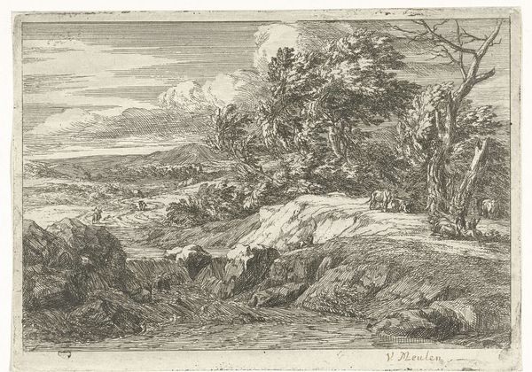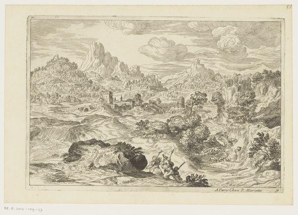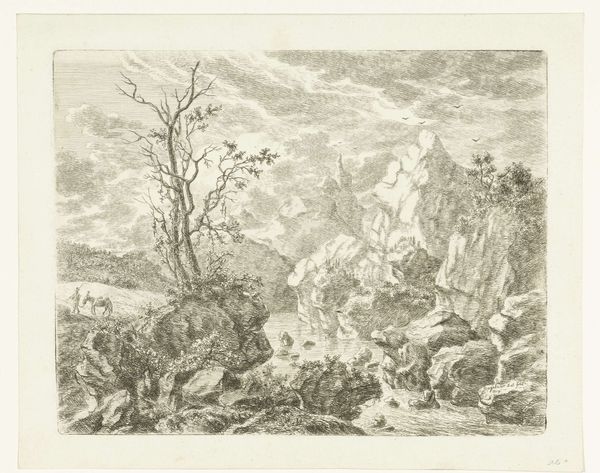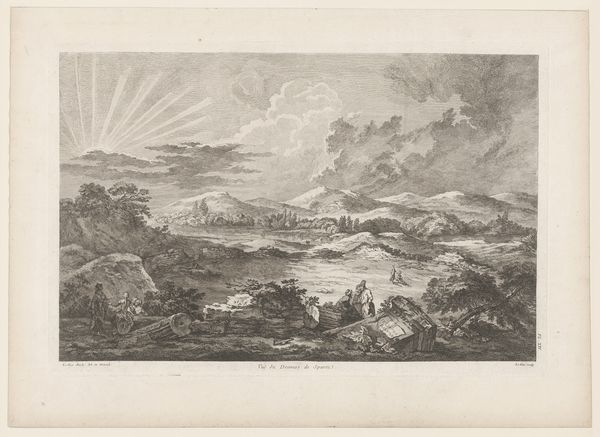 Editor: This etching, "Gezicht op het meer van Albano en Castel Gandolfo" was created between 1817 and 1888 by Joseph Meganck. It’s a wonderfully detailed landscape. What can you tell me about it? Curator: Well, the printmaking process itself is quite telling. Look at the marks - etched lines into a metal plate, likely copper, then submerged in acid to deepen those grooves, the wiping, the pressure...It all points to a deliberate act of reproduction, and thus accessibility. This image of Castel Gandolfo, once potentially only enjoyed by the wealthy on grand tours, is now circulated as a commodity. What does the democratizing of imagery tell us about 19th-century society and art production? Editor: That’s fascinating! So, even the act of creating a print changes who gets to see the artwork and what it represents? Curator: Exactly. The labor involved is also relevant. The artist likely worked in a studio, using specific tools, and possibly even employed assistants. The print then becomes a product of collaborative work, further questioning notions of individual genius. Editor: I see. So, it's not just about the beautiful landscape; it's also about how the image was produced and distributed, and how those processes impact its meaning. Does this accessibility also influence its style of realism? Curator: The realism aligns with the expanding market. Mass-produced prints catered to middle-class audiences who appreciated detailed depictions of real places, mirroring their own desire for material ownership and experience through representation. Editor: I’m going to think differently about prints from now on. Curator: Indeed, examining the material processes unlocks a whole new way of thinking about art history and its role in culture.