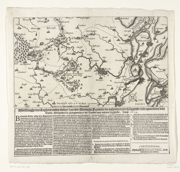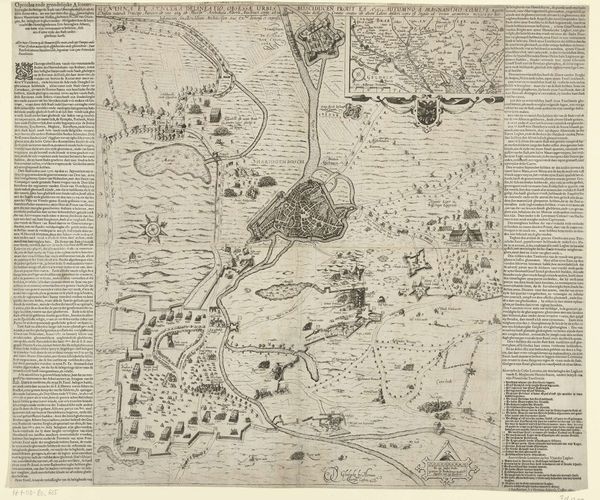 This print, made by Claes Jansz. Visscher around 1625, depicts the siege of Breda. It’s an etching, meaning that the design was first incised into a metal plate, likely copper, with a sharp tool, and then printed. Notice the incredible detail. The city itself is meticulously rendered, as are the surrounding fortifications and troop movements. This wasn’t just art; it was information, strategically disseminated to inform and influence public opinion about a key military event. The medium itself speaks to the rise of print culture, and with that, a whole new way of circulating knowledge and shaping perceptions. Etchings like this were relatively quick to produce and could be distributed widely, contributing to an emerging public sphere and the development of national identity. It’s a reminder that even images of war are shaped by the social and economic conditions of their making. Considering the history of materials and processes allows us to see the full meaning of this artwork.
