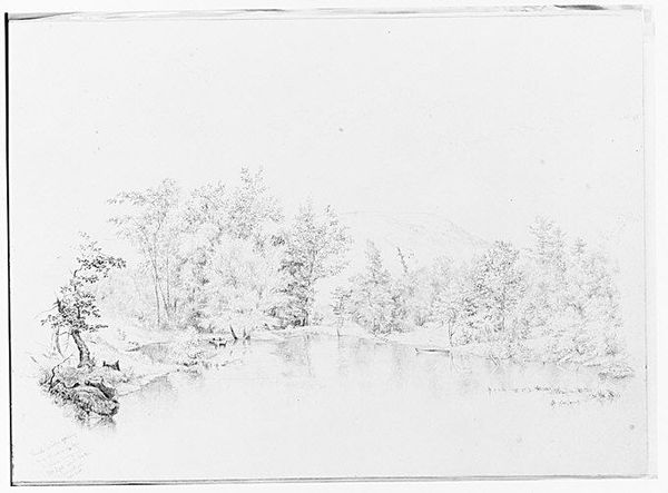 Daniel Huntington made this pencil drawing titled "Bog Meadow Pond, West Point" in 1871, from a sketchbook. Note how Huntington divides the composition roughly into thirds. The bottom third shows a densely worked foreground, almost vibrating with organic life. Vertical blades of grass, drawn with tight, nervous lines, are reflected in the water, creating a mirror image that doubles the visual information. This detailed foreground contrasts with the relative calm of the middle ground, where the pond sits, reflecting the distant mountain. Finally, in the background, Huntington sketches the faintest suggestion of a mountain range, anchoring the scene. It seems the artist is interested in the surface qualities of the landscape. By exploring the interplay of light and shadow, surface and depth, Huntington suggests a visual dialogue between the immediate and the distant, the tangible and the ethereal. The use of line and the balance of tonal values invites us to consider the formal structure.