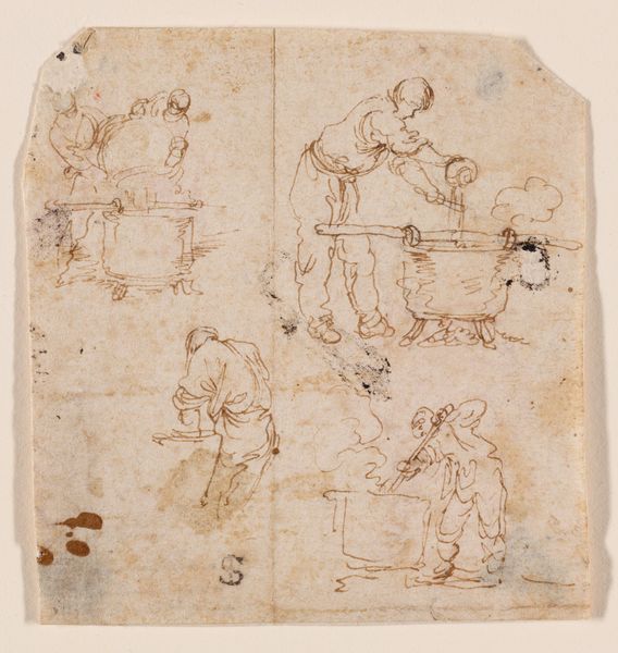 Curator: This is John Varley's "Studies of Peasant Women, and a Horseman," a sketch held in the Tate Collections. Editor: The composition feels very immediate, like a glimpse into the everyday lives of these rural figures. The lines are so light and quick. Curator: Varley was deeply interested in capturing the essence of rural labor. You see him here exploring the various poses and activities, from the seated women to the figure on horseback. The material is simple, just pen on paper, likely intended for further development. Editor: The starkness emphasizes form; the strategic use of hatching builds a sense of volume and texture. It reveals the human form beneath those garments. Curator: I am drawn to how Varley elevates these ordinary subjects through the act of close observation. He transforms everyday labor into something worthy of artistic study. Editor: Indeed, the beauty arises from Varley's ability to distill essential forms. It's a lovely example of how close study yields unexpected insights.