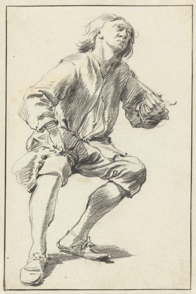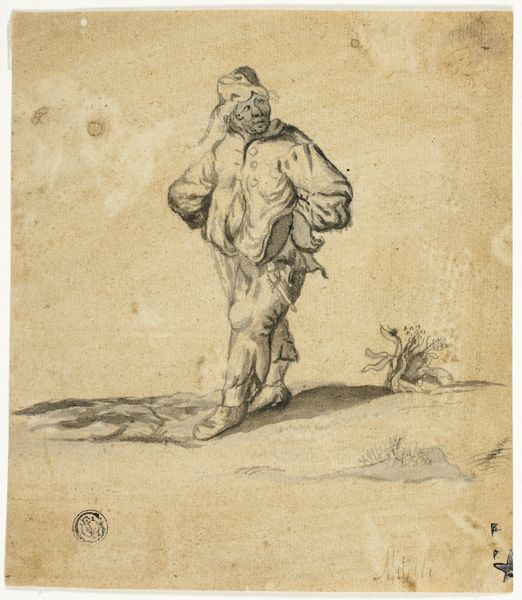 Curator: A decidedly unfussy portrayal, wouldn’t you say? What immediately strikes you about this unnamed sketch from the 17th century? Editor: There’s an almost…casual intimacy to it. Despite being just pencil and watercolour on toned paper, there's a vibrancy—the figure seems caught mid-moment, drinking from that hefty jug with genuine gusto. A very unidealized presentation of rural life I presume? Curator: The immediacy certainly transcends the medium. Observe the composition; the cross-hatching adds depth without obscuring the quick, confident lines that define the figure. Semiotically speaking, the slightly tilted jug hints at abundance, possibly referencing the bounty of labor but one might add a touch of overindulgence. Editor: That feels appropriate, I suspect such renderings of peasantry were not widely revered in their time? I wonder about its potential role within the art world of that era. Perhaps part of a larger, moralizing narrative, cautionary in nature? Curator: The identity of the artist remains a mystery, making historical positioning speculative. This unknown origin also contributes to the sketch’s charm. There's an almost rebellious subversion, contrasting it against academic rigidity and classical allusion. Editor: It does suggest that it was an exercise or personal piece. Notice the material properties: the soft gradations achieved with watercolor complement the toned paper, lending the sketch an antique quality even before age. The play of light and shadow focuses our attention on his face. Is it content, exhausted or inebriated, I cannot confidently say! Curator: I agree, although its precise function in history remains opaque, its formal properties invite ongoing evaluation. Editor: Indeed! What began as a quick draught has certainly proved engaging beyond what the artist may have first believed.