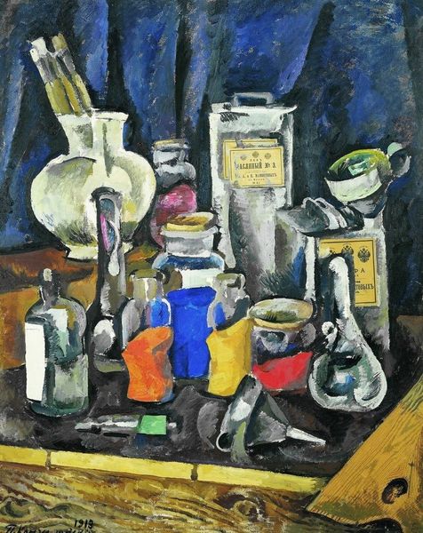 Editor: Here we have Picasso’s *The Studio,* part of the Tate collection. It's awash with light and airy colors. What do you see in this piece, particularly in the symbols he chooses? Curator: The window, acting as a proscenium, frames palm trees, themselves traditional symbols of victory and eternal life. Notice the palette: how do these optimistic colors inform your understanding of the space? Editor: It does feel very celebratory, but there's also a disquieting faceless bust. It's unsettling. Curator: Indeed. The bust could symbolize creative potential, but devoid of features, it becomes a mirror, reflecting our own anxieties about artistic creation and mortality. Editor: I see it now. It's like a stage for both celebration and self-reflection. Curator: Precisely. Picasso masterfully uses symbols to prompt a dialogue with the viewer about art, life, and everything in between.