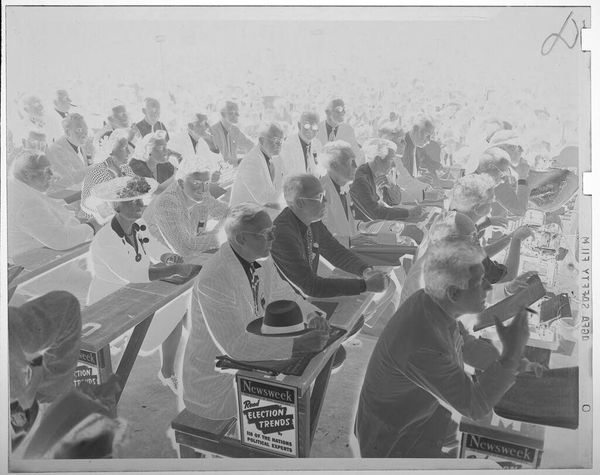 Curator: This photograph, by Martin Schweig, shows a large group of young men and women holding arms in a circle outdoors, with a middle-aged man at the center. It's simply titled "Untitled," and the dimensions are about 10 by 13 centimeters. Editor: The high-contrast and shallow depth of field immediately give it an ethereal, almost dreamlike quality, despite the mundane subject matter. The bright sky washes out details, focusing attention on the human forms. Curator: The image, likely captured in the 1950s based on the clothing styles, speaks volumes about social dynamics. Look at how this gathering possibly reflects community bonds or some ritualistic act being performed by the young generation under the supervision of an older man. Editor: From a formal perspective, the circular composition reinforces the sense of unity and containment, but the overexposure threatens to dissolve the figures, suggesting impermanence. The circle is slightly broken, which introduces dynamism and tension. Curator: The materiality of the photograph itself, the grain and the inverted tones, adds another layer. It's a physical object bearing witness to a specific time and social activity. Editor: Precisely, and the lack of information enhances its abstract power. It's more about form and mood than narrative. Curator: It really makes you think about community and the relationships within it. Editor: A ghostly snapshot that captures a moment in time.