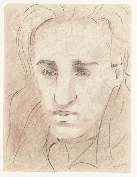 Curator: Here we have Cor van Teeseling's "Self-portrait: B-1-1," a compelling piece from sometime between 1941 and 1948. It's a pencil drawing, currently residing here at the Rijksmuseum. Editor: Immediately, I'm struck by this raw, almost melancholic feel. It's a face emerging from a soft grey void, the details so intimate and fragile. You can almost feel the graphite on the paper. Curator: Yes, the use of pencil allows for a remarkable delicacy. Self-portraits, of course, have a long history, serving as both a means of self-exploration for the artist and a statement to the viewer. Looking at the symbolism embedded, it appears vulnerable and intense. The slightly downcast gaze and the soft shading might indicate a moment of introspection or even uncertainty. Editor: I see that. I wonder what he was grappling with at the time. Those heavy-lidded eyes suggest fatigue, or perhaps a profound sadness. It’s funny, even without vibrant color, it speaks volumes about the inner landscape of this person, it creates a vivid image of how this person may have been feeling. Curator: Absolutely, and the apparent lack of contextual detail – no background, just the face – focuses our attention entirely on his expression. In that sense it pulls us into his psychological state. Perhaps he aims to represent pure subjectivity and an unfettered sense of the soul. Editor: Perhaps. To me it hints that there might be more he's unwilling to share. Is that an artist's intention, or just my interpretation? Curator: The ambiguity itself is the piece’s power, wouldn't you agree? Its universality allows a deeper engagement with our personal memories of intense emotional experience and of course, existential dread. Editor: Fair enough, It really makes you consider your own self-perception. It stays with you, doesn’t it? Curator: It does indeed. Thank you for lending your perspective. Editor: Thanks for the history.