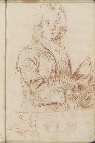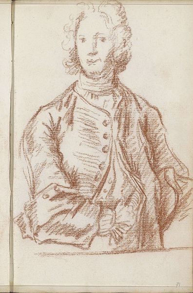 Petrus Johannes van Reysschoot created this drawing, "Man met de handen op de heupen," using chalk. Born in Ghent, Reysschoot lived during a time of shifting social structures. The rise of the bourgeoisie and the Enlightenment ideals of reason and individualism greatly influenced artistic expression. With his hands assertively on his hips, the man exudes a quiet confidence, characteristic of the era. The loose, expressive lines of the chalk capture the sitter’s personality. His slightly disheveled hair and the casual pose suggest a departure from the rigid formality of earlier aristocratic portraiture. The work hints at a more intimate, personal connection between the artist and his subject. The drawing invites us to consider the complexities of identity and representation in a rapidly changing world. It serves as a poignant reminder of the individuals who navigated the intersection of tradition and progress.