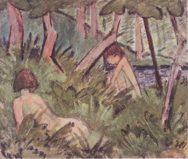 Editor: Here we have Otto Mueller's "Three Bathers in a Pond" from 1912, created with oil paint or possibly pastel. The simplified figures immersed in the water and the subdued earth tones create a rather dreamlike, intimate feeling. What do you see in this piece? Curator: Immediately striking is Mueller's formal reduction of the human figure and landscape. Observe how the bodies are rendered as flattened planes, almost dissolving into the water, devoid of explicit volume or three-dimensionality. The formal cohesion is dependent upon the limited palette; earthy yellows and browns dominate, reinforcing a sense of unity. Note how the strong verticals of the trees frame the horizontal expanse of the water, creating a spatial tension that invites close inspection. What are your thoughts on this simplified portrayal? Editor: I can see that. It’s like he’s distilled the scene to its most essential forms. I wonder why he chose to limit his palette like that. Curator: The limited palette contributes to the sense of unity, yes, but also directs attention to the variations in texture and brushwork. Look at the way he applies the paint, especially in the rendering of the water. The short, broken strokes create a vibrant surface, while simultaneously denying the illusion of depth. We might read this as an investigation of the properties of the medium itself and an exploration of semiotic systems. It is an excellent case study of Expressionism. Editor: I see, so it’s less about representing the scene realistically and more about exploring the materials and how they interact. Thank you, I hadn't noticed so much before. Curator: Indeed. And by focusing on these formal elements, the artwork challenges us to consider the very language of painting itself, its capability to communicate ideas through color and form. Editor: That's given me a lot to consider! I'm walking away with a fresh perspective.