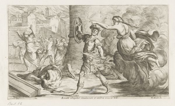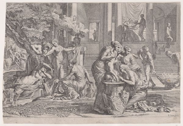 Curator: Standing before us is "A Rake's Progress, Plate 8," a print created sometime between 1795 and 1805. Editor: It's immediately unsettling. That tightly packed room and those haunted, vacant eyes suggest complete breakdown and despair. Curator: Indeed. Let's consider the conditions under which such imagery was disseminated. As a print, this image could be reproduced relatively cheaply, making it accessible to a broad segment of the population. It reflects the consumption of morality tales as popular entertainment, almost a tabloid of the time. Editor: Looking at the visual motifs, I'm struck by the pervasive symbols of madness and confinement. Notice the shackles discarded on the floor in the lower left, yet bars remain visible in the background. And what about the theatrical figures in the doorway – Pierrot-like characters observing the spectacle with a bizarre detached amusement? Curator: I'd add that the use of engraving as a reproductive process is telling here. The very act of painstakingly incising the image into a metal plate echoes the incremental decline and eventual breakdown of the rake, both in financial ruin and mental disintegration. The repetitive lines speak to laborious, manufactured image production for wide distribution. Editor: The orb hanging over their heads suggests some celestial order disrupted and the dog nipping the madman points to bestial and instinctive drives unleashed; those familiar characters in clothing signify folly’s reign, don’t they? Curator: Yes, consider also how it mirrors shifts in the perception and treatment of mental illness during that era, moving from private family matter to public spectacle and medical concern. And the conditions of its production highlight a move from artistic originality to a sort of artistic reproduction. Editor: For me, those visual elements act as a lens through which societal anxieties of the period get refracted, making madness and morality part of a theatrical drama, and bringing cultural understanding together to present itself in the arts. Curator: Examining both the image and its method of creation brings context into the social and economic implications of creating artwork within a capitalist system. The image served a didactic purpose while participating in a visual market. Editor: Through imagery of broken minds and revelry, "A Rake's Progress" invites us to probe collective fears, our human susceptibility to our base desires, and our search for social control through symbolic order.