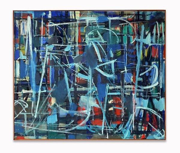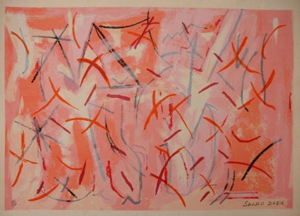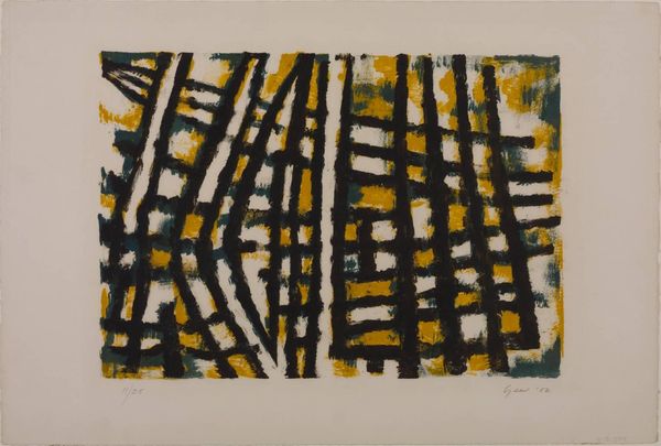 Curator: Looking at Antonio Corpora's 1952 painting "Alba/Dawn," executed in oil paint, one can immediately sense a chaotic energy that somehow resolves itself into a harmonious whole. Editor: It definitely strikes me as a bit jarring at first. So many intersecting lines! There's a sense of conflict, perhaps. It feels very anxious, as if something is about to break apart. Is it really trying to portray dawn? Curator: Well, remember this piece comes out of the abstract expressionist movement. Consider how artists like Corpora navigated the post-war period, grappling with new forms of artistic language and grappling with the socio-political issues of their time. He, along with artists worldwide, struggled to find adequate modes of expression, and sought to convey meaning by liberating the artwork from recognizable references. It wasn't merely an aesthetic choice; it was deeply connected to existential and political unrest. Editor: I hear that. But with all these geometric forms floating amidst the pale yellow, I keep searching for a grounding point. Perhaps, in the socio-political reading of it, it embodies the disorientation felt when old ideologies give way and are replaced by new uncertainties? Curator: Precisely! You can look at his dynamic composition, the very act of painting itself, as a reaction to what he observed about the world at that time. The fractured lines might represent shattered social structures or a world in conflict. The abstract composition allows him to capture a feeling, rather than depicting an easy scene or symbol. Editor: And the colors…mostly yellow, some greens, a bit of violet...there's a fragile light battling through, and despite all the angularity, it evokes a sense of hope breaking through. Is that intended to redeem the earlier sense of crisis? Curator: I appreciate you interpreting that way! Whether consciously or not, artists embed social contexts into their work, making them resonant with us even decades later. It showcases a deep human desire to not give in to conflict, that the breaking dawn implies renewal and promise. Editor: This has really challenged me to see the painting beyond just its initial appearance. I initially focused only on how I felt, which was pretty conflicted, and it never dawned on me how deeply embedded art can be with these post-war sentiments, these yearnings for resolution in social and political climates that are often in deep turmoil. Curator: It's in considering its history that its nuances and meaning emerge. Examining this context transforms how we appreciate Corpora’s work.