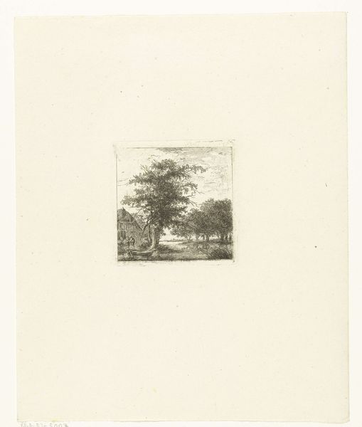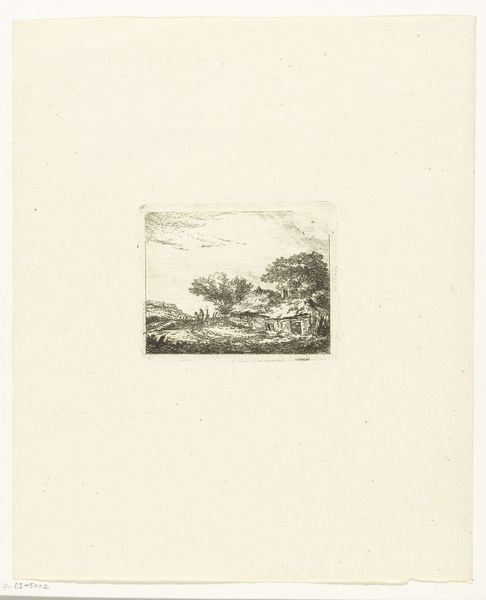 Curator: Before us, we have Willem Jan van den Berghe's etching, "Heuvellandschap met beek en brug waarop man met vee loopt," placing its creation sometime between 1833 and 1901. Editor: The overwhelming feeling it evokes is solitude. Despite the tiny figure walking the bridge, the density of the etched lines traps the viewer, almost like a dream, and imbues it with an incredible stillness. Curator: Yes, and within that feeling of solitude is perhaps an assertion of nature’s power. This print captures a pivotal moment when artists across Europe were attempting to understand their changing place in society, specifically, moving from rural lives to burgeoning urban centers. The man with the cattle reinforces this sense of change. Editor: The contrast almost turns to pure abstraction. There's a very modern push-pull between representation and flat pattern. Curator: Indeed. And even the choice of etching speaks to something. Etchings, because they are printed and reproduced, have a democratic impulse built into them. Editor: You can almost feel van den Berghe testing the limits of the etching medium, its capacity to generate atmosphere, the contrast he generates in such a small area... Curator: Exactly. The work suggests that rurality itself, this quiet pastoral scene, can be distributed. That is, one does not need to have a landed estate to enjoy it, or to be impacted by its values. One can possess a print. It's incredibly powerful when you realize the accessibility it offered at that time. Editor: I find myself drawn to how such precise work yields such an expressive effect. Its technical execution becomes part of its aura. It invites slow looking and it is interesting how an image so small manages to feel expansive. Curator: The landscape, democratized through the etching process, speaks volumes about 19th-century shifts in societal access. Editor: Agreed. Ultimately, Van den Berghe’s choices grant a real intimacy, a concentrated emotional punch in a relatively diminutive space.