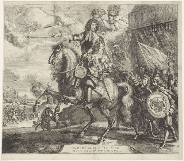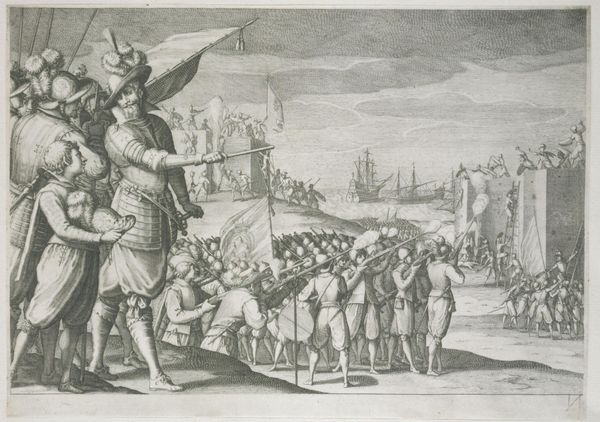 Curator: Jacques Callot’s print, Fortification of the Gate of Livorno by Order of the Grand Duke, it's like a stage set, isn't it? Very theatrical. Editor: Yes, and there's a distinct visual hierarchy at play. We see the Grand Duke, literally elevated, his gesture dominating the entire scene. It's about power, direction. Curator: Absolutely. The parasol above him, that's not just protection from the sun; it's a symbol of his authority, almost like a halo! And the workers below, scurrying like ants, their individual efforts contributing to the Grand Duke's grand vision. Editor: That teeming mass, the layers and layers of activity… it makes me think about the Tower of Babel. All this striving, but toward what unified purpose? What happens to individual identities in the face of such monumental ambition? Curator: That’s interesting. Perhaps Callot is pointing to both the ambition and the potential human cost of such projects? Editor: Precisely. There is a visual dialogue happening here between labor and power. Curator: Well, it's definitely more than just a document of a building project; it's a meditation on power, ambition, and the human spirit. Editor: Yes, it’s a tiny image, but it speaks volumes.