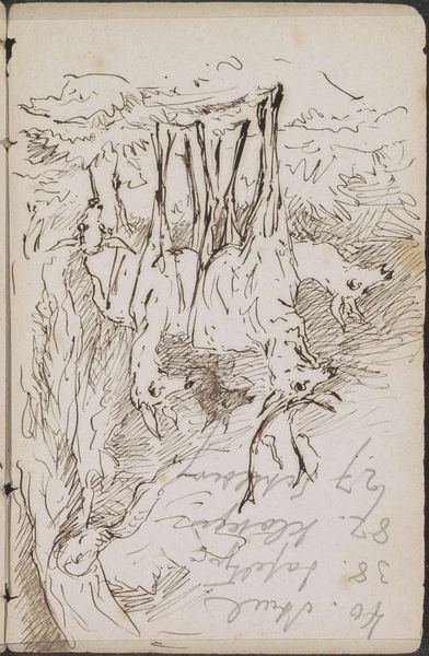 Curator: At first glance, this feels like a page torn right out of a sketchbook, all delicate lines and quiet observation. There’s something incredibly intimate about it. Editor: It really does evoke a feeling of intimacy. The pencil strokes are light, almost hesitant, like the artist, Johannes Tavenraat, was capturing a fleeting moment in time in this work now held at the Rijksmuseum. It’s entitled "Tree trunks and a man with a cow on a rope" from around 1862-1864. Curator: A title that manages to describe practically everything that's present, and yet, not really at all! Because to me, it's not just about trees and cows. The placement of that fallen tree trunk almost looming over the scene—doesn’t it suggest a sense of life cycles, decay feeding into new beginnings? It makes me wonder what the significance of the cow and her keeper may be. Editor: The cow definitely brings in that pastoral, perhaps biblical element—domesticity, nourishment, maybe even sacrifice depending on where Tavenraat's mind wandered. The image of a bovine on a lead can refer to any number of ancient practices, where the animal led is brought in for slaughter and sanctification. Look, that tree stump is clearly an altar with this logic! Curator: Maybe not everything is an altar! But I see your point. The tree's vulnerability is there. And perhaps, thinking of our man and cow as representing the everyday – life plodding on regardless – they bring a different resonance. Almost like Tavenraat placed his symbolic anchor against this natural altar. Editor: I agree with your thoughts on symbolism; it has a dual sense. Also notice the texture! Even with a quick pencil sketch he gives such dimension to that old trunk. I think Tavenraat captures the passage of time, the relentless force of nature. The light pencil work leaves room for imagination. We’re not just seeing trees, but feeling their history, you know? Curator: Exactly. It’s that quiet power, that silent witnessing that makes it sing to me. Thanks, that insight truly changed how I view this small landscape. Editor: Well, hopefully, this short look has opened some avenues of viewing the symbolism ingrained even in simple sketch-work for our audience, as well!