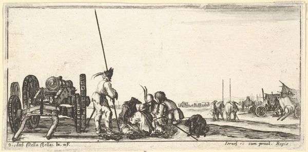 William Hogarth created this etching titled 'Breaking the Legs' around 1725. It depicts a brutal scene of Roman military punishment, a reflection of the artist's interest in social critique. Notice how Hogarth illustrates the raw violence inflicted upon the soldiers, highlighting the abuse of power within the military structure. The image resonates with the artist's broader commentary on social injustices. In eighteenth-century England, the military was a complex institution, often preying on the working classes, promising opportunity but delivering harsh realities. Hogarth himself came from a background marked by financial struggles. Consider how the artist uses the graphic imagery to elicit a sense of horror and empathy in the viewer. He challenges the traditional glorification of military might. Hogarth invites us to confront the darker aspects of authority and the human cost of conflict.