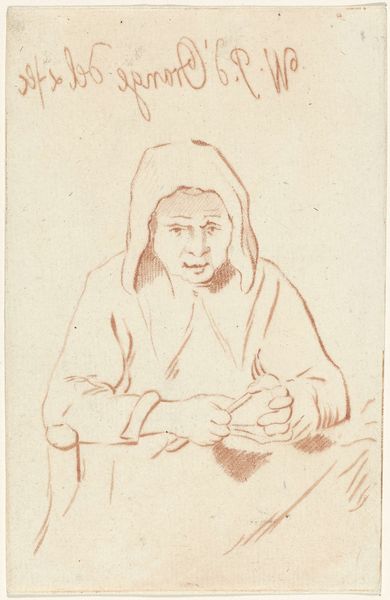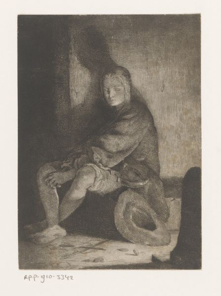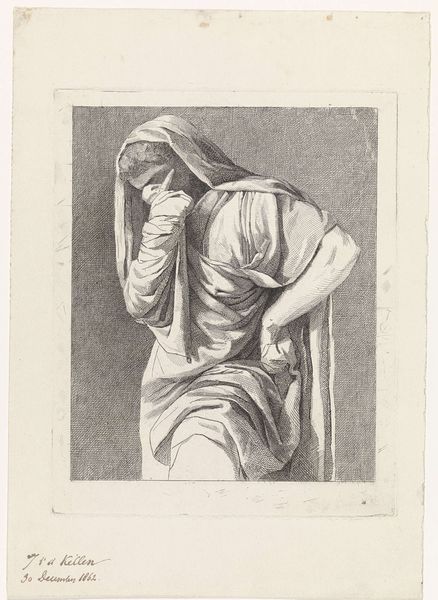 Editor: This is "Zittende vrouw in overpeinzing," or "Seated Woman in Thought," by Marcantonio Raimondi, dating from 1510 to 1527. It's an engraving, and the incredible detail achieved through the intaglio process is quite captivating. I'm curious, what strikes you most about the choices made in creating this print? Curator: For me, the appeal of this piece hinges on its creation as a multiple, and what that represents culturally. Raimondi, an engraver and printmaker, operated during a crucial period when printmaking was becoming more accessible. What was formerly the purview of manuscript illumination could suddenly be disseminated more widely. He was a key figure in popularizing the work of artists like Raphael through prints. Editor: So you're saying that access to tools and techniques influenced how artworks circulated. Curator: Absolutely. Consider the economic implications. Producing engravings, rather than unique paintings, involved a different kind of workshop structure and skill set, creating new roles within artistic production. The use of metal plates, the labour involved in engraving--these choices shifted artistic agency and changed how art reached its audience. Editor: I never thought about it that way. The print almost feels like a mass-produced version of what would’ve been a painting accessible only to those who commissioned it, a new mode of image circulation in early modernity. Curator: Precisely! By examining the material basis of art, we unlock narratives far beyond just style and subject. Editor: That’s a totally fresh way of thinking about prints from this era. Thanks, I’ll definitely remember to consider the production process, going forward. Curator: My pleasure! Focusing on those processes opens so many avenues to discover hidden meanings and contextual nuance!