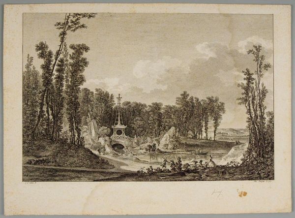 Editor: This is Jeanne Deny's "View of the Environs of Madrid". The delicate lines of the engraving give the landscape a serene feeling. What stands out to you about this piece? Curator: The etching process itself is key. Consider the labor involved in creating this image—the tools, the acid, the paper. How does this reproductive technique democratize access to landscape imagery? Editor: So, it's less about the scene itself and more about how it was made and distributed? Curator: Exactly. It makes us question the traditional hierarchy of painting and printmaking. The accessibility challenges the idea of unique, high art objects. Editor: That’s a great point. I never thought about it in terms of accessibility and labor. Curator: Thinking about art through the lens of its production and consumption gives us a richer understanding.
