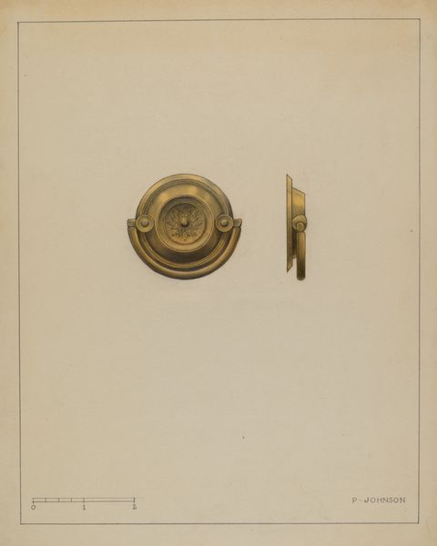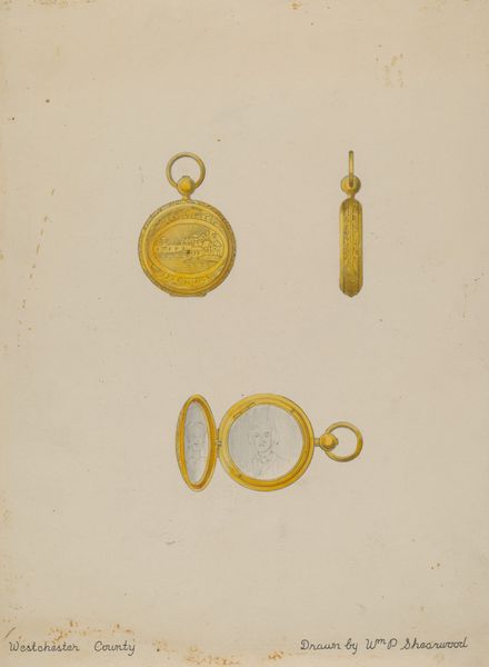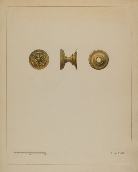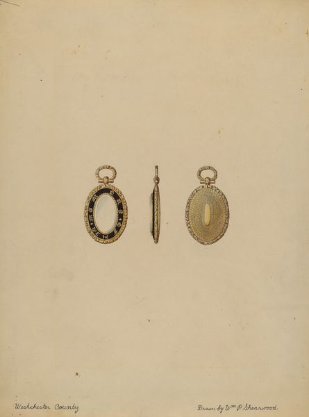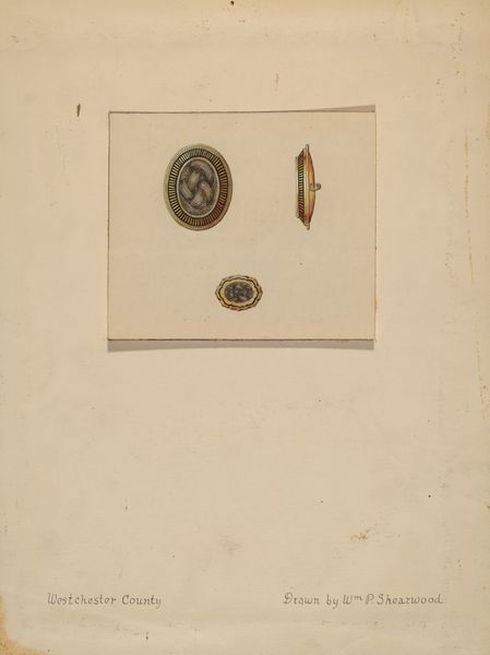 Curator: John H. Tercuzzi’s drawing, “Cuff Buttons,” circa 1936. A beautiful watercolor and ink on paper. Editor: The miniature cyclist trapped inside is quite poignant! Almost like a Victorian-era memento mori... with spokes. Curator: Interesting observation. It also evokes the clean lines of the Art Deco period, perhaps hinting at a functional elegance. Think about the time these were made. During the Depression people still longed for a certain refined style even with limitations on budget. Editor: Right, utility is key! I see the metallic detailing which reminds me of production lines and an aesthetic informed by new machines of this period. It looks like these are intended for reproduction at scale? Are there factory marks of any kind on the artwork? Curator: I see what you mean! But these appear to be watercolor renderings; they showcase how to fabricate the components, rather than objects that have been factory-produced, I should note that Tercuzzi spent time teaching decorative design, so this might be something of an imaginative exploration of this role. Editor: Design blueprints… interesting… the medium then becomes the message! We are seeing Tercuzzi’s artistic labour displayed for an unseen commissioner. Do we know where the drawing was likely made or for whom it was commissioned? Curator: Not with any certainty. However, thinking about decorative arts from this time often involves considering their relationship to consumerism and ideas about what constitutes value and who is it made for. There’s definitely room for a richer contextualization around that, perhaps asking people what status a pair of cufflinks represents to them… or a bicycle. Editor: Hmm, well, my interest lies in how designs become real objects, transformed in factories... the potential tensions or synergies in labor practices. It gives these cufflinks… substance, somehow. Curator: And for me, it sparks wonder—almost childlike in its detail and design… So perfect to adorn a suit cuff. I wish these tiny objects could spin out more stories! Editor: From rendering to reality! Or an investigation of material’s potential: now I would love to find where Tercuzzi fits into industrial history!