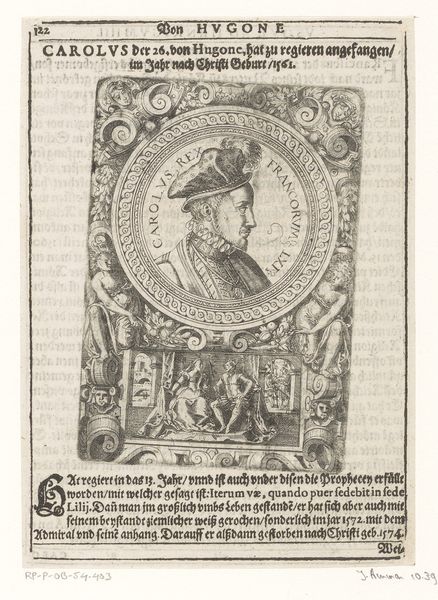 Editor: This engraving, "Portret van Frans I van Valois-Angoulême, koning van Frankrijk," by Jost Amman, dates back to 1598. The tight hatching of the pen work lends a great sense of texture. I'm struck by the contrast between the detailed portrait and the looser sketch of a battle scene below. How would you interpret the choices Amman makes in composing this print? Curator: Aesthetically, the division Amman creates between the portrait and the battle narrative contributes to a formal tension within the composition. Note the contrast in the application of line weight. The density and precision dedicated to rendering the royal figure command the eye, reflecting an emphasis on the individual. However, the compressed scene below hints at wider historical forces and the contextual background of his reign. Editor: It's interesting you point out the difference in the linework. So you're suggesting that contrast between styles serves to highlight specific elements within the piece, placing them in a visual hierarchy? Curator: Precisely. Also, consider how Amman manipulates the frame—the circular border around the portrait, compared with the rectangular field of the battle. It imposes a visual structure to guide our reading. The carefully detailed frame draws the eye inwards towards Francis' likeness, and this formal element establishes a separation from and an order over the depicted chaotic battle, giving order to the representation. Editor: So, it's less about accurately depicting a historical moment and more about using visual techniques to create meaning within the print itself. Curator: Indeed. It's in the meticulous construction and formal qualities of the work itself that the print's impact truly resides. The artist manipulates medium and arrangement to underscore key concepts within. Editor: I see. Thanks for showing how paying attention to these internal relationships allows us to find deeper significance. Curator: My pleasure. Attending to such structural details reveals so much.