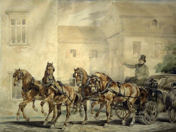 Curator: What strikes me first is the soft, almost dreamlike quality of this piece. It feels very idyllic. Editor: Indeed. Let’s delve a bit into Wilhelm Marstrand’s “By the Well Outside the Village,” created between 1810 and 1873. It employs watercolor and ink, a testament to the delicate sensibilities of the time. The painting, essentially, is an oil on paper, right? Curator: Yes. A captivating depiction of rural life! I am particularly intrigued by how the image constructs our view of agrarian communities. There's a certain idealization, isn’t there? Notice the way the figures are positioned. It invites us to imagine them and how the men on horses are positioned higher than the well-keeper who does most of the heavy lifting. How do the figures negotiate access to water? I think the painting speaks to dynamics around social hierarchy, gender, and rural economies. Editor: The clothing really pinpoints certain power dynamics. A red hat on one of the men while the ladies' heads are tied up as well; It is impossible to ignore these nuances and what it means for who has autonomy within the village. What seems like just a charming tableau reveals deeper layers upon closer inspection. How are labor roles differentiated by gender? What stories do the horses whisper about the broader economy? These are the narratives that pulse beneath the serene surface of "Ved brønden uden for landsbyen." Curator: Precisely. The setting—outside the village—also adds a layer. It prompts reflection about the intersection of private lives and the public commons that dictate the politics of how we consume resources, especially in small areas. Water is for everyone, so it begs the question of what access to life's resources are and who truly gets that right. This perspective of viewing it as a historian gives light on seeing art as a means of documenting change and questioning established powers. Editor: The composition is brilliant and it reminds me to examine what visual pleasure itself might conceal. We’ve been conditioned to overlook disparities by attractive aesthetics. Curator: Marstrand's use of delicate watercolor washes seems deceptive for such heavy themes, doesn’t it? Editor: Yes. But with art like this we have tools to deconstruct how aesthetics perpetuate certain worldviews. I find that to be powerful, don’t you?