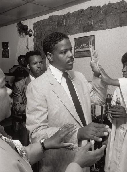 Editor: This untitled gelatin silver print by Thomas Roma from 1993 really strikes me with its sense of quiet intensity. The monochrome adds a layer of seriousness to the scene. What's your take on it? Curator: Ah, yes, Roma. He had a gift for capturing those fleeting moments, didn’t he? For me, this image sings of faith and community, a silent harmony of individuals caught in a shared ritual. The monochrome elevates it, stripping away the distractions of color to focus on texture, light, and, dare I say, soul. Notice how the hands raised aren't uniform? It’s as though each person is connecting to something deeply personal within this collective act. Editor: I see that now. The textures really do stand out—the fabric of the clothes, the different skin tones... Were gelatin silver prints common then? Curator: Absolutely. Gelatin silver was the workhorse of photography for decades. Its rich tonal range and relative permanence made it ideal for capturing, well, life. And in Roma’s hands, ordinary life is made extraordinary. Look at the light illuminating each face— almost reverential. What do you suppose is being said in this scene? Editor: Maybe a prayer, or some sort of benediction? I like how the photograph offers intimacy despite there being so many people in it. Curator: Precisely! Roma masterfully used his lens to offer that feeling. Perhaps this photo also challenges us to think about what brings us together in moments of uncertainty. He certainly gave me much to think about when I first viewed the work! Editor: It makes you feel as though you are in that very room, part of that shared experience. I see that, thank you!