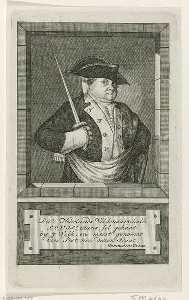 Editor: So, this is "Frans Decker" by Cornelis van Noorde. It's an etching, and I’m really struck by the emphasis on his tools – the palette, brushes. What can you tell me about the process of making this kind of artwork? Curator: Notice the sharp lines and the cross-hatching, indicating the labor-intensive process of etching. The print suggests a system of artistic production; this image could be easily and widely reproduced. How does this affect our understanding of artistic value in this context? Editor: That makes me think about how widely distributed images changed art appreciation! Thanks for clarifying!