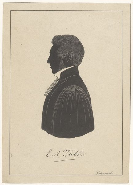 This is Friedrich Heinrich Wilhelm Schröder’s ‘Silhouetportret van de heer Deeleman,’ created sometime in the mid-19th century. During this period, silhouette portraits were a popular and accessible way to capture a person's likeness, a shadow of someone's life. Portraying the subject in profile, Schröder's silhouette aestheticizes Deeleman, abstracting him in a manner that subtly reflects the societal norms of the time. As an art form, silhouettes often served the middle class, documenting family members, preserving a record of themselves for posterity. We can see signifiers of the sitter's profession in his attire, perhaps alluding to Deeleman's social standing and occupation. The starkness of the silhouette renders the subject almost ghostly, leaving us to consider the narratives, and perhaps the emotional weight, of those whose stories are often untold. Consider how this simple yet evocative portrait invites us to reflect on the individuals of the past and how they navigated the world.
