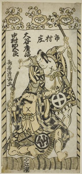 Curator: So, here we have a print by Torii Kiyohiro from 1754, currently residing at The Art Institute of Chicago. Its rather a mouthful, but the full title is “The Actors Segawa Kichiji II as Okichi, Bando Hikosaburo II as Shuntokumaru, and Onoe Kikugoro I as Sagizaka Bannai in the play "Yura Sengen Tsuki no Minato," performed at the Ichimura Theater in the eighth month, 1754.” Editor: Wow, that title is almost as long as the play must have been! My first impression is that the figures look...packed together. It’s busy, but somehow it creates a sense of contained energy, a dramatic flourish held within a very defined space. Curator: Exactly! And that containment is really key when we look at ukiyo-e prints within the larger socio-political context. This print functioned as a form of celebrity culture. These weren't just actors; they were stars, idols. Their likenesses, depicted here in elaborate costumes and striking poses, circulated amongst the public, reinforcing theatrical trends. It created an interesting dynamic: popular theater fueled the art, and the art boosted theater revenue and reputation. Editor: It's wild to think about that kind of star power translated into prints back then, like ancient Instagram, I suppose? And I'm intrigued by the horse--it adds a touch of realism amidst all the stylized figures, almost comically stoic given what must be some crazy plot line from the sounds of the title. Do you think Kiyohiro aimed to portray specific nuances from the play? Curator: To a degree. While we might not know every detail of "Yura Sengen Tsuki no Minato," Kiyohiro and other artists were keenly aware that print sales depended upon capturing the audience's imagination. Elements would have reflected recognizable scenes and helped solidify actor-character associations, strengthening public engagement. In this case the central theme of retribution that the play depicts and it’s costuming would have made a statement, the use of colour and ink serving the practical purpose of capturing emotion as well as a story that many at the time would be aware of. Editor: It’s almost voyeuristic in a way, isn't it? Peeking into a cultural moment so far removed from our own, where entertainment was packaged and consumed in such a deliberate, aesthetic way. These actors knew they were being immortalized as icons while playing out fictional roles in fictional scenarios – it’s meta. Curator: Indeed! The blurring of realities adds a layer of complexity to this seemingly simple print. And seeing how theater influenced trends, political sentiment and overall societal narrative reminds you that entertainment plays a much bigger role than people sometimes allow for. Editor: So true, even after nearly 300 years it still has such incredible presence! Curator: Indeed. It prompts contemplation and connection. Thank you. Editor: Couldn’t have said it better myself! Thanks!