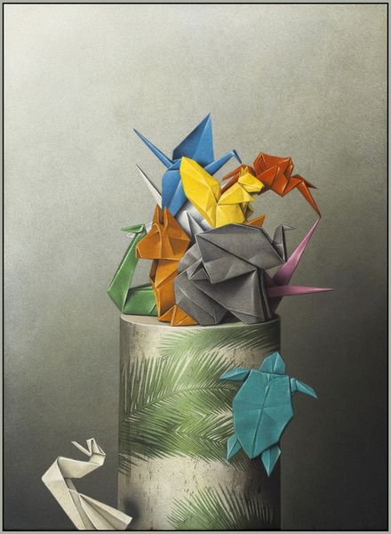 Editor: Eckart Hahn's "Smaragd," created in 2016, seems to be an assemblage of mixed media, mostly cardboard it looks like. The geometric shapes, all wrapped and taped in green, give the impression of an abstracted plant form or perhaps some kind of futuristic architectural model. What strikes you most about this piece? Curator: I see a direct engagement with the discarded detritus of consumerism. The cardboard, the tape, these are the very materials that facilitate the movement and sale of commodities. The labor involved in transforming these humble materials into this geometric sculpture elevates the everyday. Where do you see the line between high art and craft in this work? Editor: Well, I initially saw it as purely sculpture. But now that you point it out, I guess it's hard to ignore the materials. There's definitely a handcrafted feel. Is the fact that it imitates a crystal relevant? Curator: The choice of "Smaragd," emerald in German, suggests an ironic commentary. The artist uses incredibly low-cost materials to mimic something precious, calling into question our values. The process, the layering and wrapping of materials, becomes the defining characteristic, almost negating any pretense of intrinsic value. Consider the amount of taping that Hahn uses. It shows how much work and labor is hidden behind such creation, as if deconstructing established high art production norms. Editor: That's interesting. I was focused on the final form, but the labor behind it, the construction process, changes how I see it. It makes the art much more down to earth. Curator: Exactly! Hahn forces us to look at the materiality of the art object and think about the systems that create and sustain both art and commerce. Now when you consider this piece, do you think it could ever lose its effect or significance? Editor: Hmm... perhaps as cultural attitudes shift toward sustainability, upcycling practices could overshadow the novelty of Hahn’s approach and use of repurposed material? Thanks, this was illuminating. Curator: Indeed. Seeing art through the lens of materials and process reveals much more than aesthetic qualities alone.