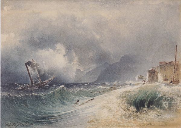 Editor: So, here we have “Three Men in Rowboat off Rocky Coast,” a watercolor drawing on paper by the Circle of Henry Barlow Carter. I am immediately struck by the feeling of the sea—the movement in those waves, and that somewhat hazy sky… it feels a little ominous, a little isolating. What’s your take? Curator: It whispers to me of solitude and man’s battle against nature's immensity. Those figures in their tiny rowboat, bravely navigating choppy waters under a vast sky… It also feels deeply British to me, with that distant gothic structure on the clifftop – a suggestion of history, of legends. Does that isolation speak to you of anything else, maybe a personal memory? Editor: Hmm, a memory... maybe growing up near the coast? It feels both familiar and unsettling, like a childhood dream that you can’t quite grasp. But that gothic structure, what's its role here? Curator: Ah, that's a touch of the sublime! The gothic ruin lends a weight of history, contrasting the temporal struggles of the men with a permanence and stoicism. The contrast elevates the landscape to more than just scenery, no? What kind of stories does it create for you, seeing those details combined? Editor: I guess it gives the whole scene a sort of epic feel. Three guys in a boat suddenly become these adventurers battling fate… Thanks, I’m now seeing so much more. Curator: Wonderful, isn't it? And to think, that's just from some watercolour on paper. Editor: Yes! Thank you.