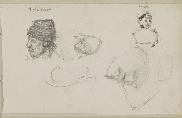 Curator: This is James McNeill Whistler's sketch, "Man Smoking," housed right here at the Harvard Art Museums. Editor: It's intimate, almost voyeuristic. The thin, scratchy lines feel spontaneous, like a stolen moment. Curator: Whistler's use of line is indeed masterful. Note the economy with which he renders the figures, barely suggesting form yet conveying a wealth of character. Editor: I'm drawn to the idea of the smoker as a symbol of bohemian life—the freedom to indulge, to contemplate, separate from the daily grind. Curator: Perhaps, but consider how the composition itself directs our gaze—the central figure dominating the space, his pose radiating authority. Editor: True, but even this authority feels fragile, undone by the sketch’s very impermanence, its rawness. Curator: It shows how much we can glean from so little—Whistler's ability to suggest entire worlds with minimal means. Editor: A reminder that even the simplest sketches can carry profound insights into society and self-expression.