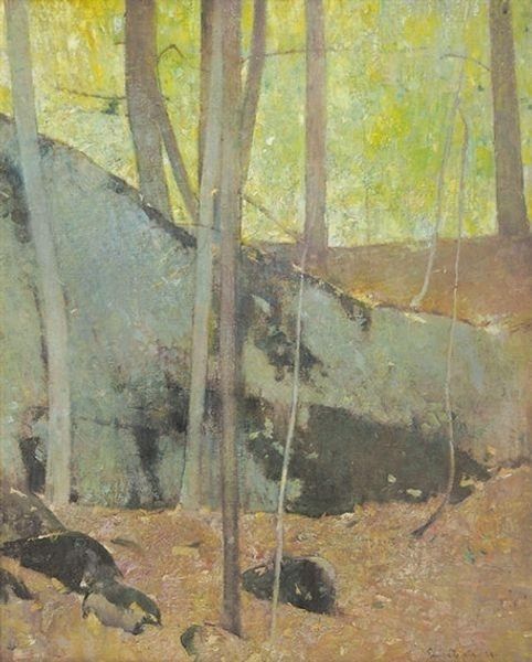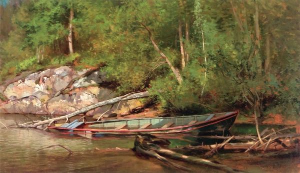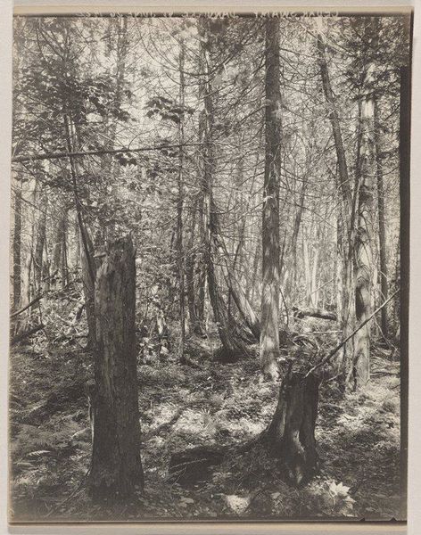 Curator: Winslow Homer's "Hunter in the Adirondacks" presents a lone figure within a dense woodland. The painting is held here at the Harvard Art Museums. Editor: It’s evocative, almost melancholy. The hunter seems dwarfed by the scale and density of the forest, despite his agency within it. Curator: Homer’s watercolor technique is masterful here. Notice the paper itself seems to be part of the scene, adding a rawness to the materiality of the woods and the hunter’s labor. Editor: It’s interesting to consider how the image speaks to notions of wilderness and American identity. Is it romanticizing self-reliance or perhaps critiquing human encroachment? Curator: The means of survival become the focus through the representation of the hunter and his catch. A reflection, maybe, on the consumption and exploitation of resources. Editor: I find it compelling how the work's ambiguity can provoke such varied readings of man's relationship to nature.
