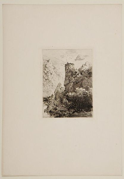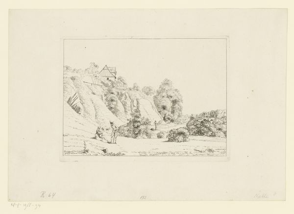 Jean Jacques de Boissieu made this landscape scene, ‘Berglandschap met figuren bij een steen en een man met twee ezels op een pad’, using etching, a printmaking technique. The drawing is incised into a metal plate with acid; the depth of line determining the amount of ink it will hold. Notice how the thin, precise etched lines give the impression of depth, drawing the eye into the mountainous background. De Boissieu masterfully uses the etched line to create texture and shadow, giving the rocky landscape and figures a tangible quality. The landscape shows working class figures: traders with mules and resting wanderers, as well as engineering works such as the dam that dominates the midground of the drawing. The printmaking process, itself involving skilled labor, allowed for the widespread distribution of such images. Consider how this connects to broader social issues of labor, class, and consumption in the 18th century, particularly the value placed on both artisanal skill and depictions of everyday life.