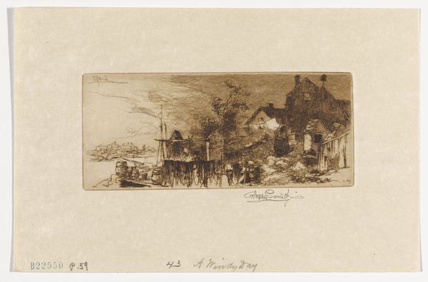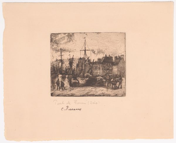 Curator: This is Camille Pissarro’s etching, "Haven van Rouen," created sometime between 1883 and 1885. What are your immediate thoughts? Editor: My first impression? The grit! It’s all grime and industry—the air thick with the breath of steamboats and labor. It feels more like a study of human industry than a picturesque harbor scene, frankly. Curator: Indeed. Pissarro captures the working harbor. The softness of the etching lends itself well to rendering the atmospheric conditions – the steam and mist that envelop the scene, don't you think? There’s also a feeling of constant motion. Editor: Absolutely. Look at how the lines emphasize the machinery, the stacks, and what seems to be cargo being loaded. He is obviously preoccupied with showing the movement and transfer of goods as essential labor and the true subject of modernity. But what truly intrigues me is his chosen method; that Pissarro turns to printmaking suggests an appreciation for dissemination and the democratization of art that is far more radical than is afforded by conventional oil painting on canvas. Curator: Interesting point, as it wasn’t so typical for Impressionists to engage in printmaking at the time. This etching embodies the Impressionist style with its attention to the fleeting moment, but there is also his strong understanding of composition; and he is very good at the interplay between light and shadow. The industrial revolution’s visual manifestations are right here, but they feel somehow softer than in the paintings of some of his contemporaries. Editor: I would agree, but not for reasons inherent to Pissarro’s disposition. Rather, printmaking techniques are particularly suited to the depiction of fleeting atmospherics. More fundamentally, the relationship to reproduction complicates the romantic, auratic image of artistic geniuses favored at the time. By printing the “Haven,” the means by which people consume the image fundamentally challenges entrenched ideas about creative originality, while acknowledging new markets afforded by growing industry. Curator: So, the "grime," as you so aptly called it initially, extends beyond the surface of the subject matter? Editor: Precisely. Pissarro makes visible the mechanisms, both social and industrial, that propel the late 19th century forward, or perhaps drive it mad. Curator: I’ll definitely remember that, the next time I stroll along a bustling harbor! Editor: Indeed, may it spark a greater sensitivity for how art redefines value, even in our world today!