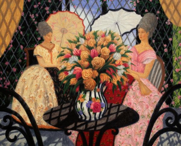 Curator: Today, we are looking at a work by Iwo Zaniewski, titled "Baroness Wundermantelstein". This piece is a portrait done with oil paints, embracing a figurative style reminiscent of genre paintings. What strikes you initially about this piece? Editor: My immediate reaction is a sort of controlled theatricality. The subject's posture is quite rigid, and the immense hair feels like a commentary on constructed femininity, especially considering the space and implied wealth surrounding her. It feels staged. Curator: Yes, I can see that. I find it particularly interesting how Zaniewski seems to be playing with ideas of aristocratic portraiture and its connection to the performance of gender and class. The Baroness seems almost trapped by her finery. Editor: Absolutely, and the use of oil paint lends a certain richness to the dress, doesn’t it? It also appears, with her seated, that her presence looms very large. How does the choice to present her in this interior setting shape our understanding, from a historical perspective? Curator: Contextually, these settings were about affirming status, reinforcing societal roles. Her interior space functions as both a backdrop and a cage, a carefully curated prison. The presence of the room speaks of material culture, power structures and ultimately what someone’s role would have been. The exterior glimpsed out the window highlights a difference. Editor: It’s interesting that even though we lack a definitive date for this work, it still sparks these reflections on the social history and institutions framing aristocratic subjects and women. Perhaps this lack of dating invites conversations about continuity or challenges to traditions across time periods? Curator: Indeed. Without a date, the portrait’s power dynamics stay relevant for modern reflections on historical depictions of wealth and influence in modern visual culture, as well as, particularly, what they represent for contemporary artists, even now. Editor: This piece feels layered with potential readings. Thinking about the interplay between self-representation, social positioning and visibility... I could explore these questions for days. Curator: Yes, it's one that keeps revealing more upon each visit, each deeper interrogation.