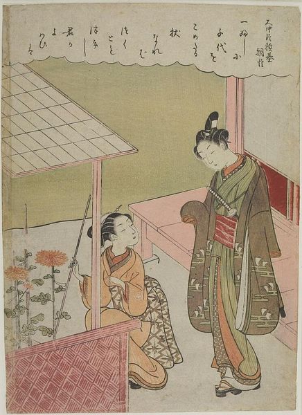 This print, by Suzuki Harunobu, is part of an untitled series of Thirty-Six Immortal Poets. The artist uses delicate lines and soft colors, primarily pinks and greens, to construct an intimate scene of two women on a veranda. Notice how the composition uses the architecture of the veranda itself—the receding lines of the steps and the vertical divisions of the screen—to create a sense of depth within a flattened space. This flattening is typical of ukiyo-e prints, and it engages with broader questions about perspective and representation. The artist uses these lines to lead the eye around the space, highlighting the details. The way the lines of the kimono fold and flow, combined with the curves of the women’s hairstyles, destabilizes the geometric composition with a graceful tension between structure and fluidity. This tension is a key element of the artwork's aesthetic and conceptual power.