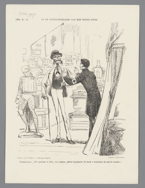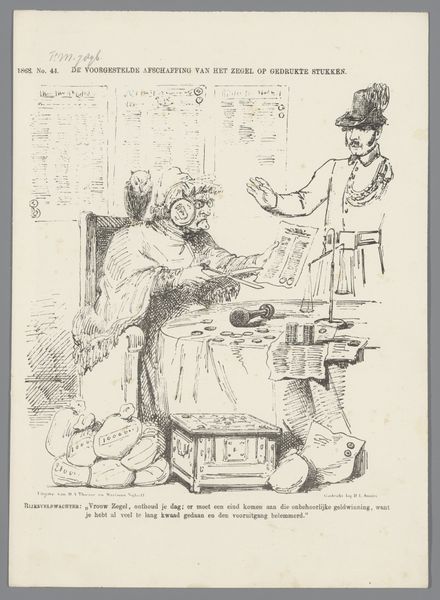 In this lithograph from 1870, Johan Michaël Schmidt Crans captures the essence of a political moment in Alkmaar with remarkable economy of line and form. The composition is immediately striking for its starkness. Three figures flank an armchair. The chair bears the inscription 'Alkmaar.' The artist employs simple lines to delineate the characters and setting, yet the image is rich in implied detail and narrative. The figures are rendered with varying degrees of formality, suggesting a hierarchy or tension among them. The lithographic medium allows for sharp contrasts, emphasizing the satirical edge of the piece. Crans uses the visual language of caricature to make a pointed comment on the political climate. The figures' gestures and expressions, though subtly drawn, speak volumes about the power dynamics at play. The 'Alkmaar' chair is presented as a vacant place, ripe for contention. This lithograph is not merely a snapshot of a local election, it's an exploration of political maneuvering, visualized through carefully chosen lines and forms.