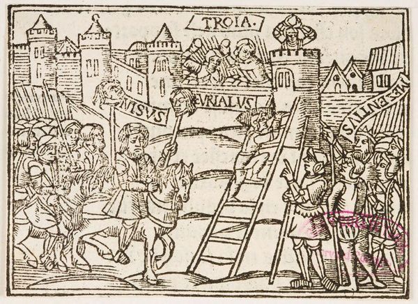 Curator: This is Illustration LIX, a compelling woodcut illustration by an anonymous artist, currently held in the Harvard Art Museums. Editor: My first thought? It feels like a stage play, with each scene carefully arranged in this limited space. Curator: It’s fascinating how the artist utilizes line to create depth and movement. The banners reading "Turnus" and "Mesapus" suggest a narrative, likely pulled from classical literature. The materials would have been widely accessible, meaning this story could reach a broad audience. Editor: Exactly! It's a beautiful example of art democratized through process. I’m left wondering about the social commentary embedded in this seemingly simple design. Curator: And I see the emotional weight, the hopes and fears, etched in those tiny figures! Such grand stories, condensed into a miniature drama. Editor: The labor involved in this piece is considerable and represents skill but also the time commitment that is involved in creating images such as these. Curator: A labor of love and craft. Its enduring appeal lies in that delicate balance. Editor: Absolutely, a testament to the power of accessibility in art.
