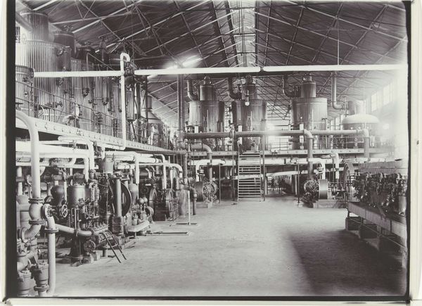 Editor: This photograph, taken between 1925 and 1930 by Isken, captures the interior of a sugar factory in Java. The sepia tones and industrial machinery create a sense of starkness. What catches your eye, what story does it seem to tell? Curator: It's a potent image, isn't it? The geometric patterns of the architecture and machinery, combined with the figures lurking in the periphery, recall the grand ambitions of the early 20th century. Look closely—how would you describe the overwhelming presence of the machinery itself? Editor: Well, they feel powerful but also almost dehumanizing in scale. There is something romantic about industry. Almost a modern, metallic cathedral. Curator: Precisely! The photographer is transforming something mundane, even oppressive, into a symbol of progress, progress rooted in colonialism. Notice the pipes, those circulatory systems. What are they "feeding"? Consider the psychological implications, too—the contrast between human labor and mechanized power. It almost carries an ambivalence towards industrial development. Editor: It’s making me consider the unseen costs of that progress. Curator: Indeed. It acts as a mirror, reflecting both our aspirations and our anxieties about the rapid changes in the world, and those changes become solidified as historical objects loaded with cultural memory. Editor: This has definitely reshaped how I initially saw the photograph. I appreciate that it encourages me to reflect on it more deeply. Curator: The power of images lies in their ability to provoke precisely that kind of contemplation, stirring our awareness of collective history through even the most seemingly straightforward compositions.